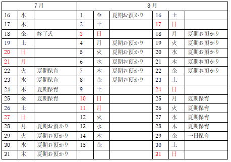 基本的に終了式・始業式は小学校と同じ日となります。ただし、夏休み期間中は下記の日程で保育を行っております