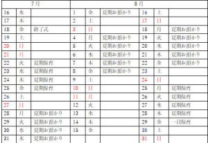 基本的に終了式・始業式は小学校と同じ日となります。ただし、夏休み期間中は下記の日程で保育を行っております。・夏期お預かり保育(希望制)があります。(※教育日数には含まれません。) 例:令和7年度の予定